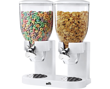Two plastic canisters together keep 35 ounces of cereal and snacks fresh....Doubles as dry food dispenser for nuts, candy, granola and more
